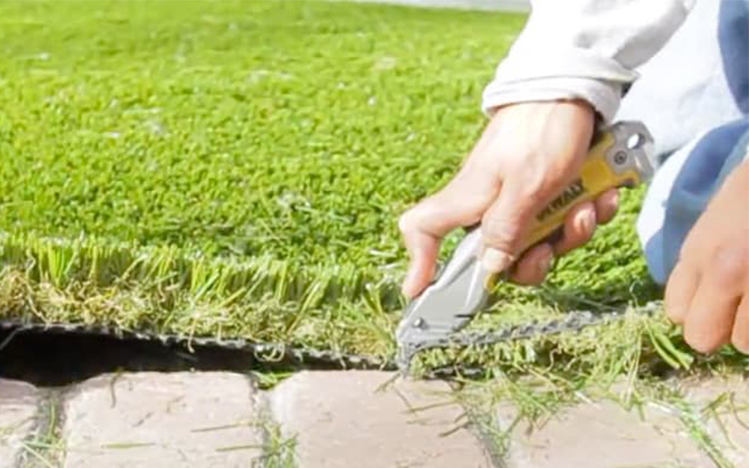 10. When laying the artificial grass, ensure it fits up to the outer perimeters. Where there is an obstacle (like a tree or post), fold the grass back and decide the shortest route to cut. Then cut between the tufts. Take care not to trim any of the blades of grass as this will create a poor seam.