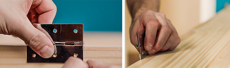 - Screw each hinge in place with one (centre) screw. The hinge knuckle should stick out from the frame edge.