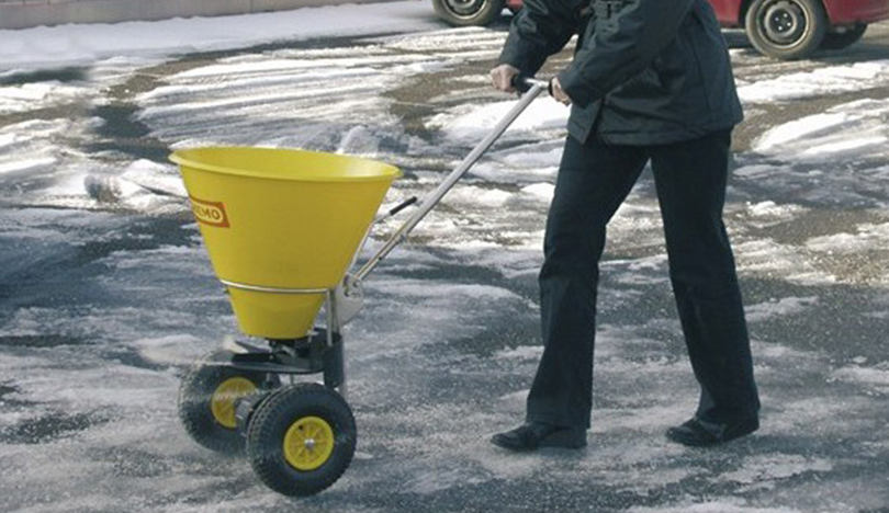 If you need to treat large areas use a salt spreader. There are various different models available, from handheld spreaders, push along spreaders even motorised ride on salt spreaders. These machines allow you to spread rock salt at different rates quickly and easily.