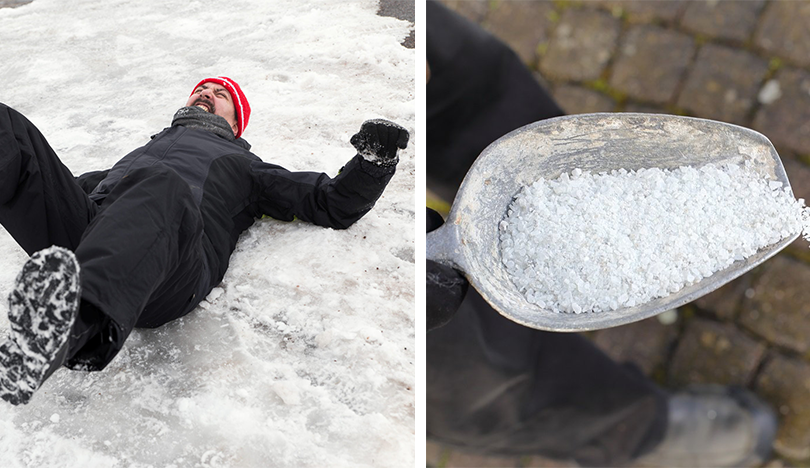 Once the shovelling part is done, you can apply the rock salt, making sure you cover all hazardous areas. After this, you will see the ice starting to melt. If you have any areas of thick or hardened ice, these areas may need more time and maintenance, but do note that adding more salt doesn't necessarily mean it'll melt more or quicker.